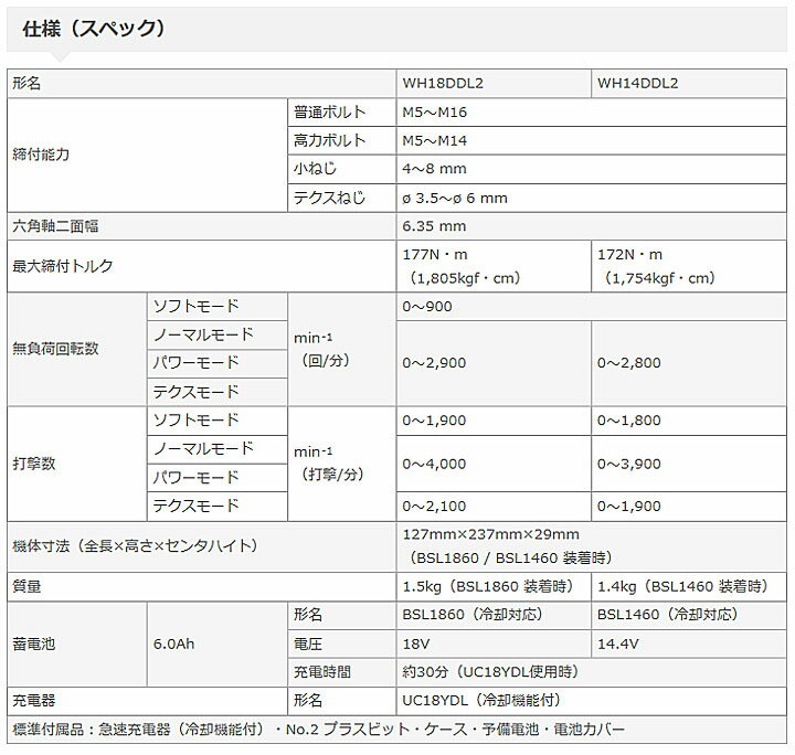 【仕様】 ●締め付け能力:小ねじM4〜M8、普通ボルトM5〜M16、高力ボルトM5〜M14、テクスねじφ3.5〜φ6 ●1充電当たりの作業目安:なげしビス(φ4.0×50mm)約4070本 ●充電時間:約30分 ●無負荷回転数(min[[の-1乗]])強:0〜2800 ●無負荷回転数(min[[の-1乗]])中:0〜2800 ●無負荷回転数(min[[の-1乗]])弱:0〜900 ●無負荷回転数(min[[の-1乗]])テクス:0〜2800 ●打撃数(min[[の-1乗]])強:0〜4000 ●打撃数(min[[の-1乗]])中:0〜4000 ●打撃数(min[[の-1乗]])弱:0〜1900 ●打撃数(min[[の-1乗]])テクス:0〜2100 ●最大締付トルク(N・m):177 ●色:グリーン(L)、レッド(R)、ブラック(B)、ホワイト(S)、イエロー(Y)の5色からお選びください ●無負荷回転数(回/分):0〜900(ソフトモード)、0〜2800(ノーマルモード、パワフルモードテクスモード) ●打撃数(回/分):0〜1900(ソフトモード)、0〜4000(ノーマルモード、パワーモード)、0〜2100(テクスモード) ●質量:1.4kg 【セット・付属品】 ●電池パック(BSL1860)×2個 ●充電器(UC18YDL) ●No.2プラスビット ●ケース 【納期】メーカーに在庫があれば、約3日(営業日)で出荷します。