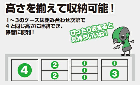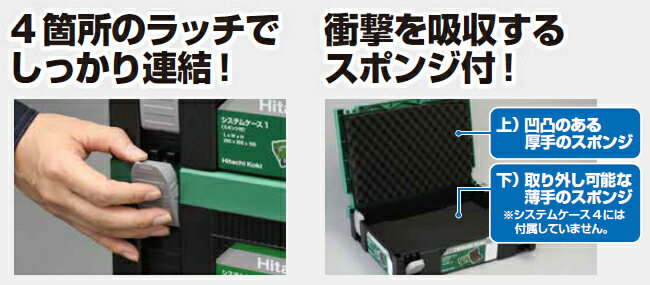 商品の特徴 HITACHI純正別売部品 ●積み重ねて連結できる![システムケース&キャスター] ●収納できる大形ハンドル付! ●4箇所のラッチでしっかり連結!衝撃を吸収するスポンジ付! ●高さを揃えて収納可能!1〜3のケースは組み合わせ次第で4と同じ高さに連結でき、保管に便利! 対応機種 - 積み重ねて連結できる![システムケース&キャスターシリーズ] システムケース1 No.0040-2656 W395×D295×H105mm システムケース2 No.0040-2657 W395×D295×H158mm システムケース3 No.0040-2658 W395×D295×H210mm システムケース4 No.0040-2659 W395×D295×H315mm キャスター No.0040-2660 最大荷重100kg 日立工機 関連商品 コードレスインパクトドライバ WH18DDL2(SR スペシャルレッド) WH18DDL2(SB ソリッドブルー) コードレスインパクトドライバ WH14DDL2(LYCK)(L:緑) WH14DDL2(LYCK)(R:赤) WH14DDL2(LYCK)(B:黒) 4mmボード用ドライバ W4SE(R:赤) W4SE(L:緑) W4SE(B:黒) W4SE(W:白) 椎茸ドリル DW12SA(S) コードレスインパクトレンチ FWR18DGL(LEGK) ロータリハンマドリル DH28PBY 100Vマルチツール CV350V コードレスハンマドリル DH18DBL(2LYPK) (ドリルビット別売り) エンジンヘッジトリマ CH22EBP(62ST) コードレスクリーナ R10DL(LCS) 日立工機 No.0040-2656 システムケース1 日立工機 No.0040-2657 システムケース2 日立工機 No.0040-2658 システムケース3 日立工機 No.0040-2659 システムケース4 日立工機 No.0040-2660 システムケース用キャスター